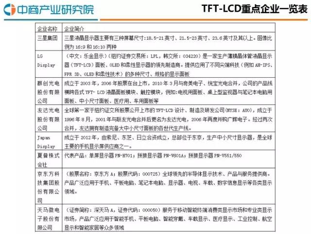 TFT-LCD特點與應(yīng)用分析:全球TFT-LCD重點企業(yè)主要有韓國LGDisplay、三星,臺灣群創(chuàng)光電股份有限公司和友達光電股份有限公司,以及日本JapanDisplay,國內(nèi)的京東方科技集團股份有限公司近些年業(yè)務(wù)增速很快。